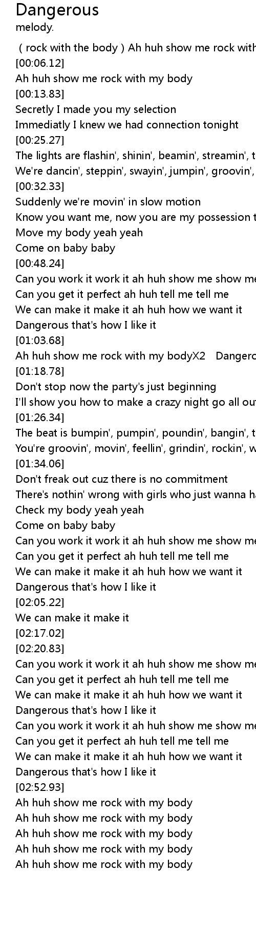 | [01:03.94] | Ah huh show me rock with my bodyX2 Dangerous |