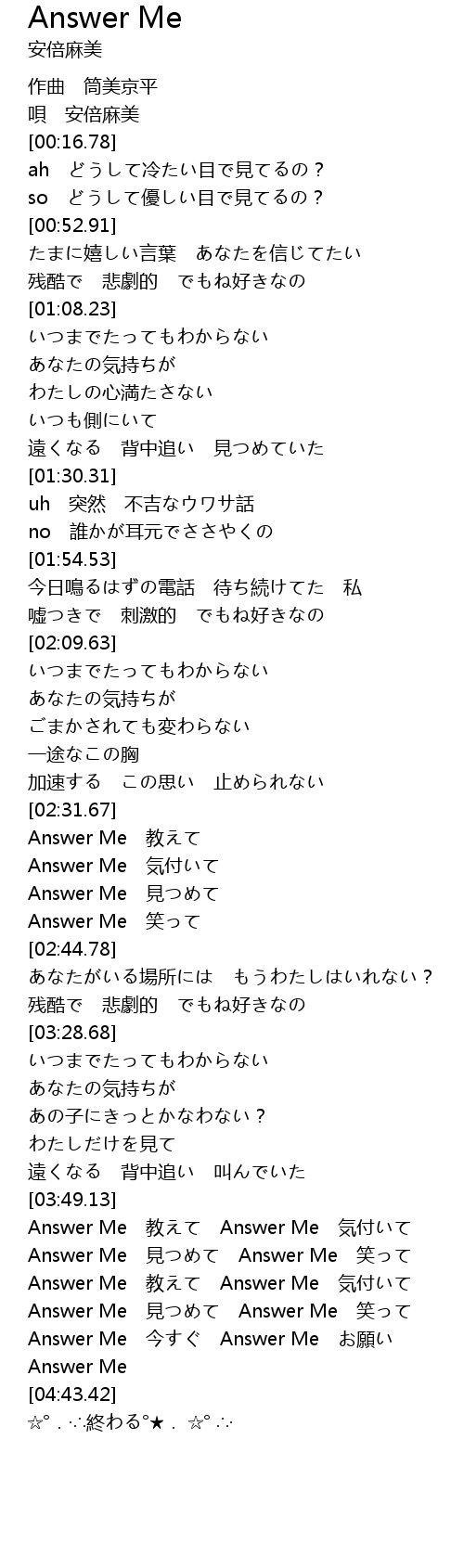 | [04:01.74] | Answer Me 教えて Answer Me 気付いて |