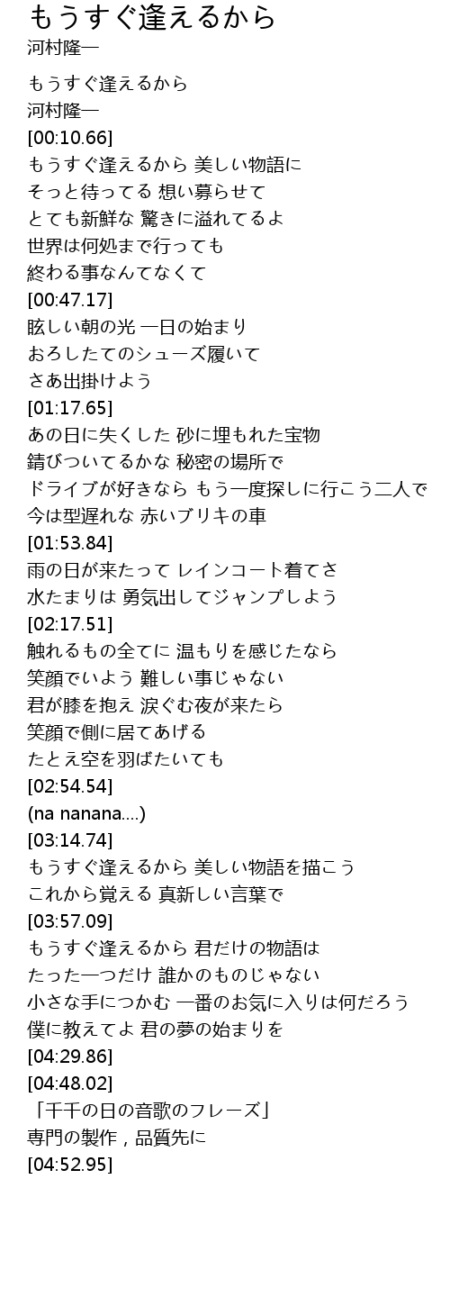 | [03:39.56] | もうすぐ逢えるから 美しい物語を描こう |
