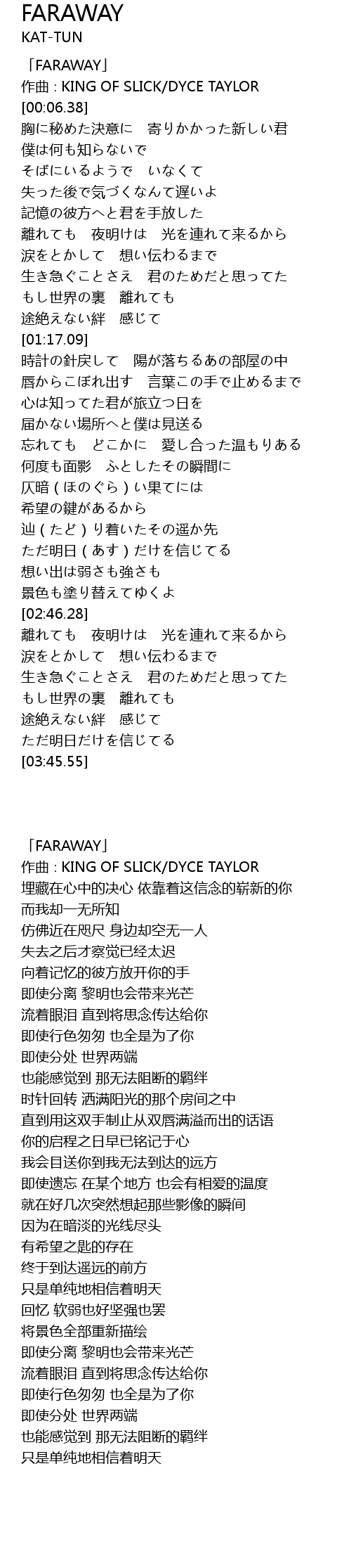 | [03:01.95] | 離れても 夜明けは 光を連れて来るから |
