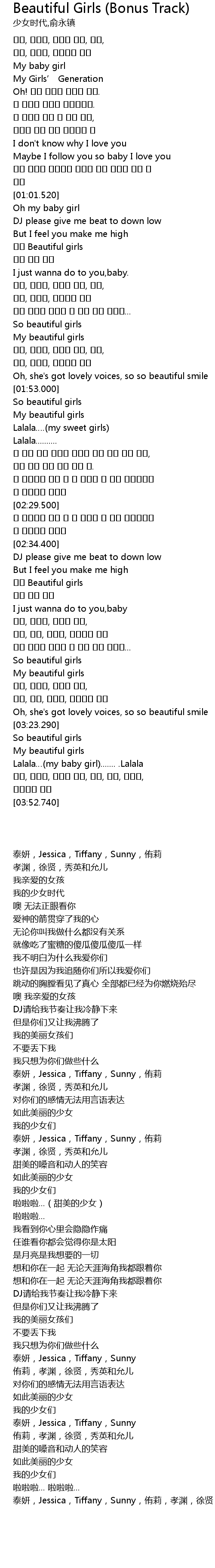 | [03:45.870] | 泰妍,Jessica,Tiffany,Sunny,侑莉,孝渊,徐贤,秀英和允儿 |