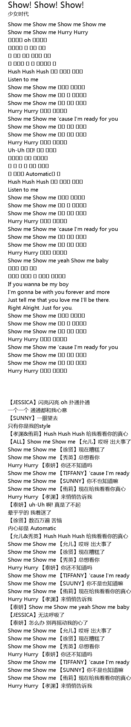 | [00:08.479] | Show me Show me Hurry Hurry |