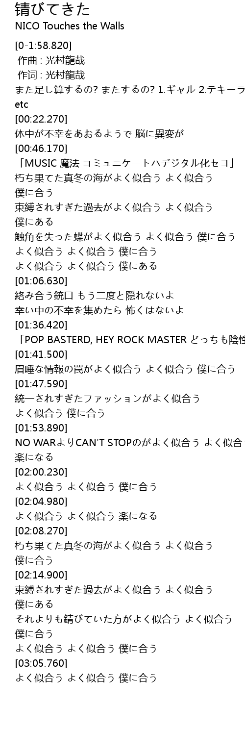 | [03:00.180] | それよりも錆びていた方がよく似合う よく似合う 僕に合う |