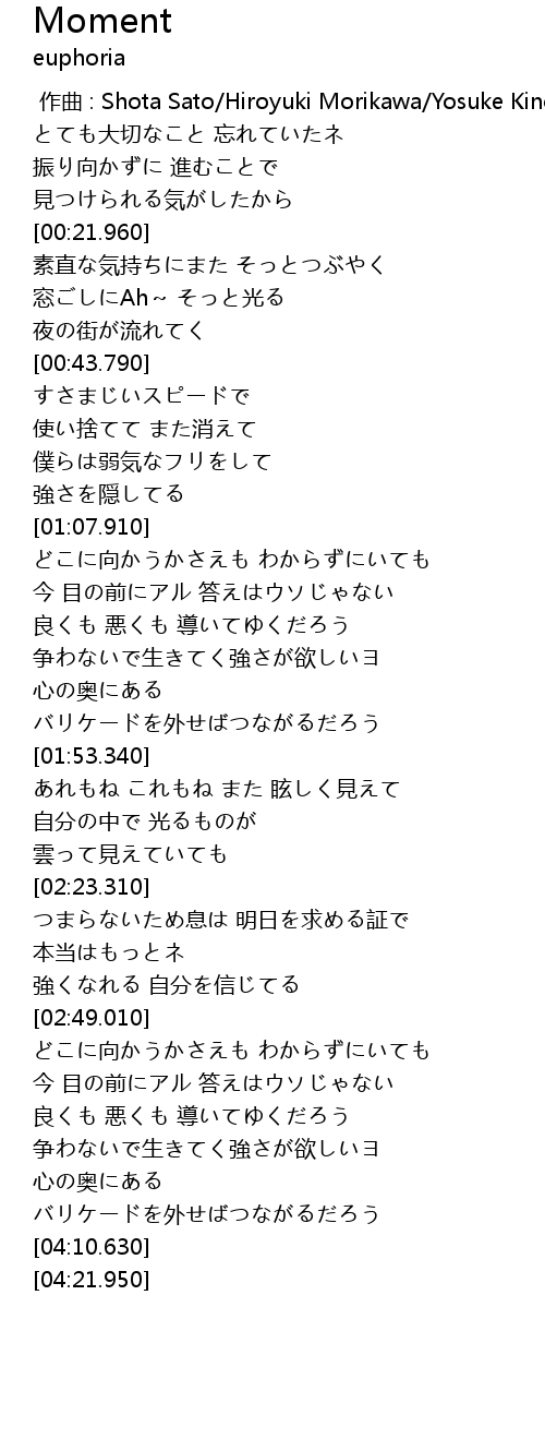 | [00:00.000] | 作曲 : Shota Sato/Hiroyuki Morikawa/Yosuke Kinoshita |