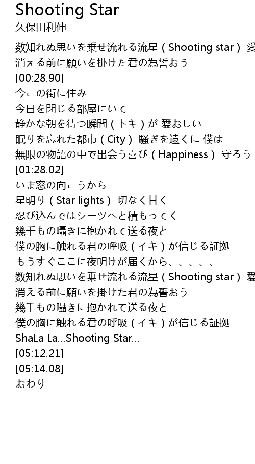 | [00:05.72] | 数知れぬ思いを乗せ流れる流星(Shooting star) 愛を |