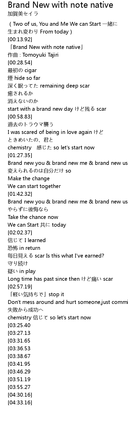 | [04:11.44][03:41.95] | Brand new you brand new me brand new us today |