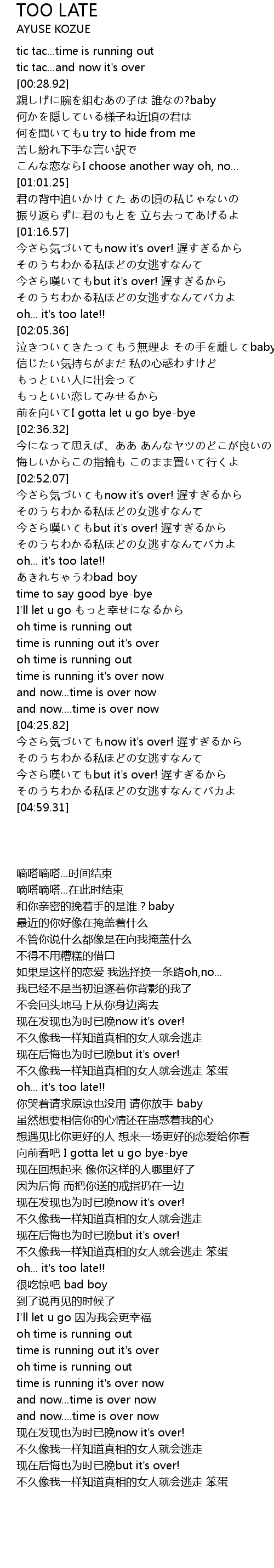 | [04:43.02] | 今さら嘆いてもbut it's over! 遅すぎるから |
