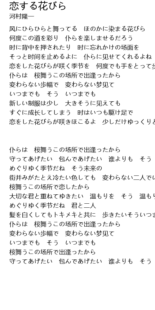 | 恋をした花びらが咲きほこるよ 少しだけゆっくりと歩きたいね | |