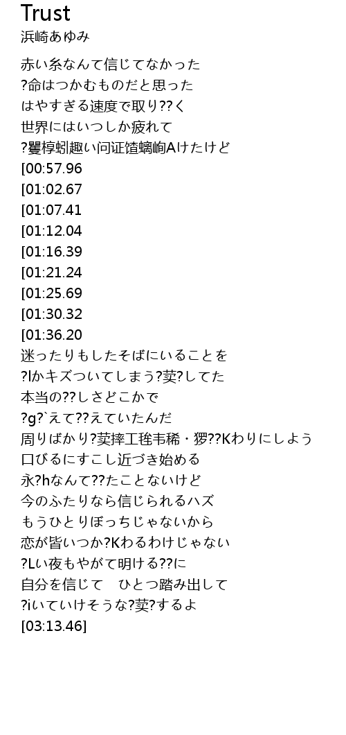 | [02:05.14] | ?lかキズついてしまう?荬?してた |