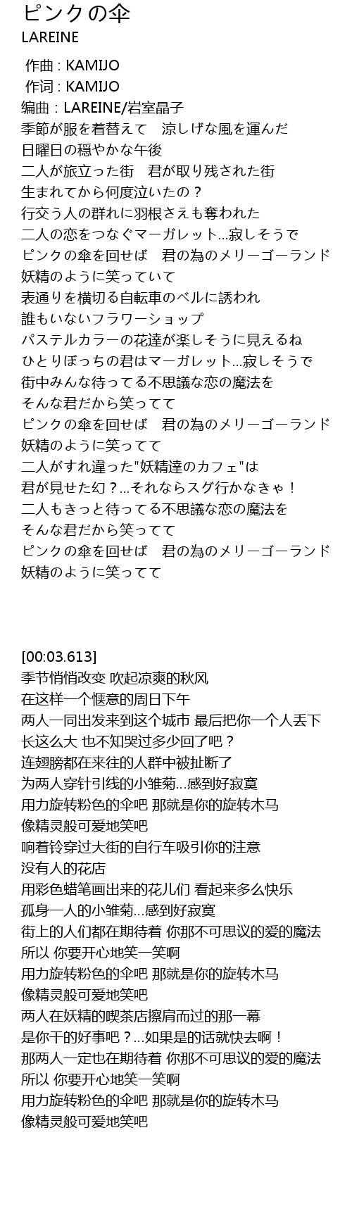 | [02:47.281] | ピンクの傘を回せば 君の為のメリーゴーランド |