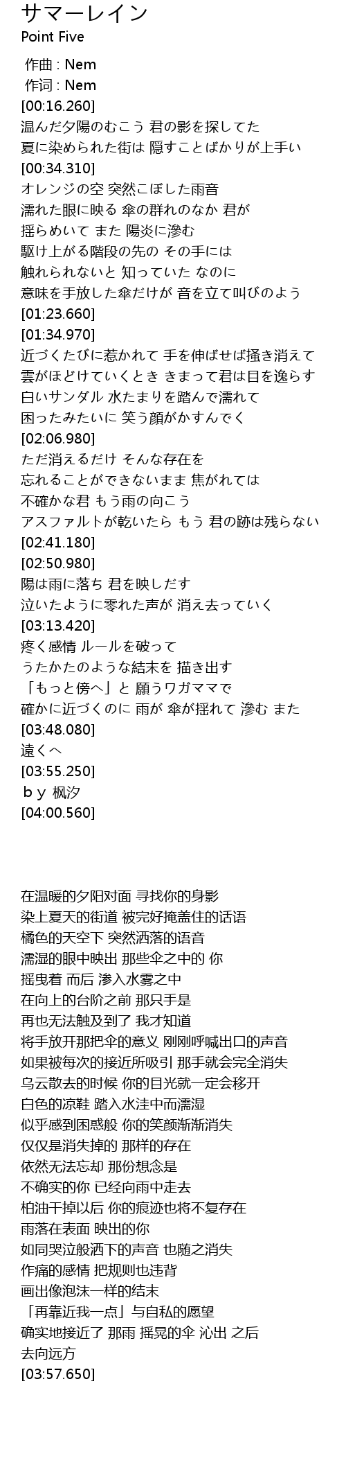 | [01:52.140] | 白いサンダル 水たまりを踏んで濡れて |