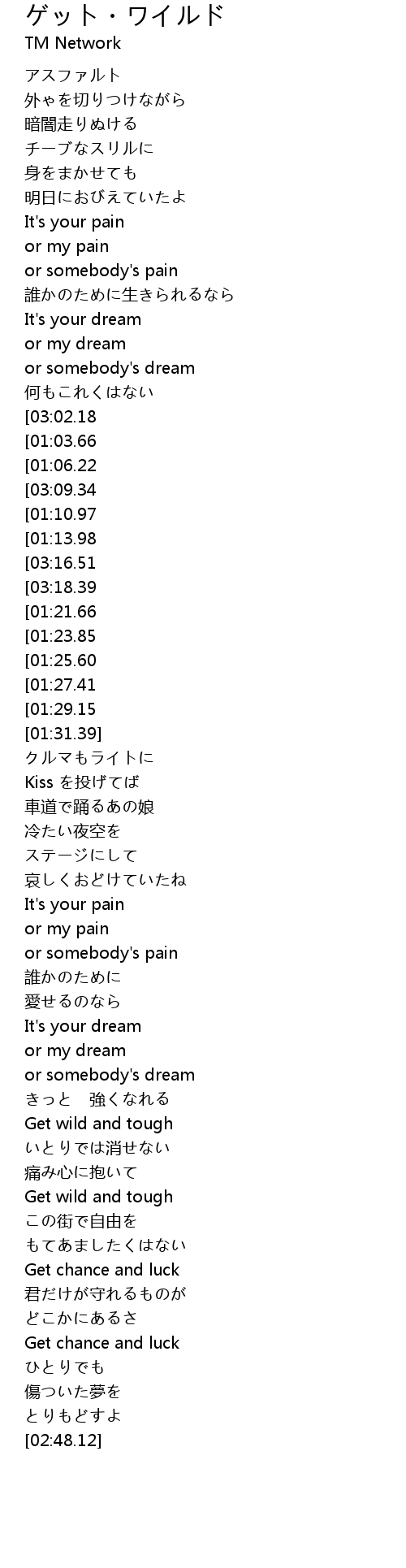 | [03:31.34][03:02.18][01:01.96] | Get wild and tough |