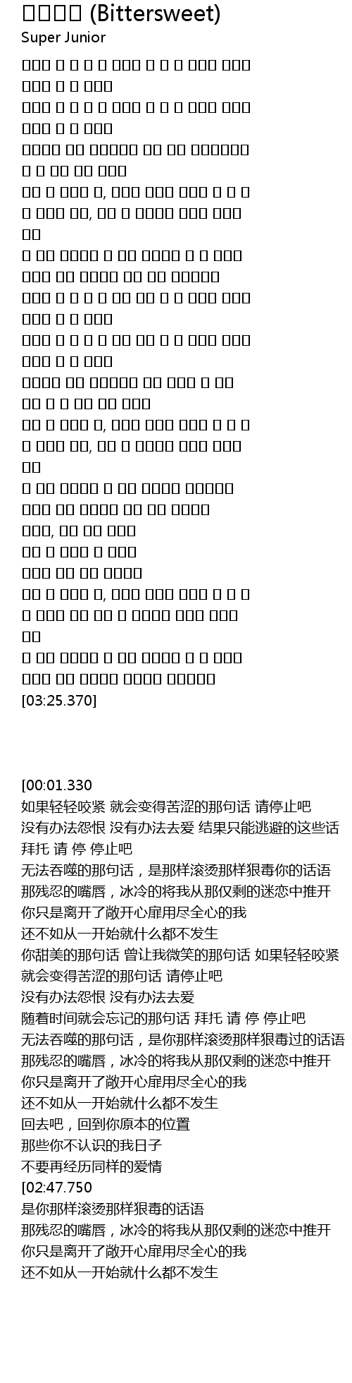 | [00:01.330] | 달콤한 네 그 말 날 죽이는 네 그 말 가만히 깨물면 쓰디쓴 그 말 그만해 |