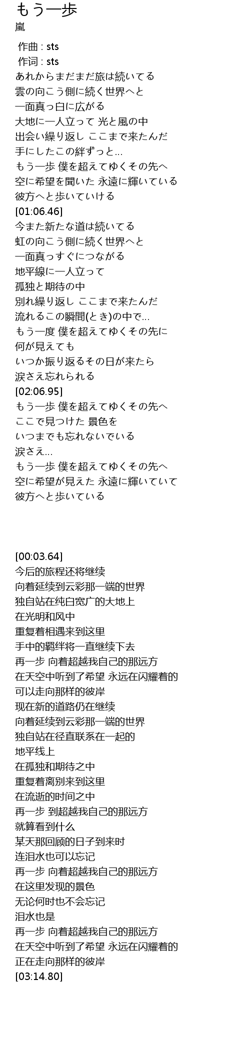 | [00:44.62] | 再一步 向着超越我自己的那远方 |