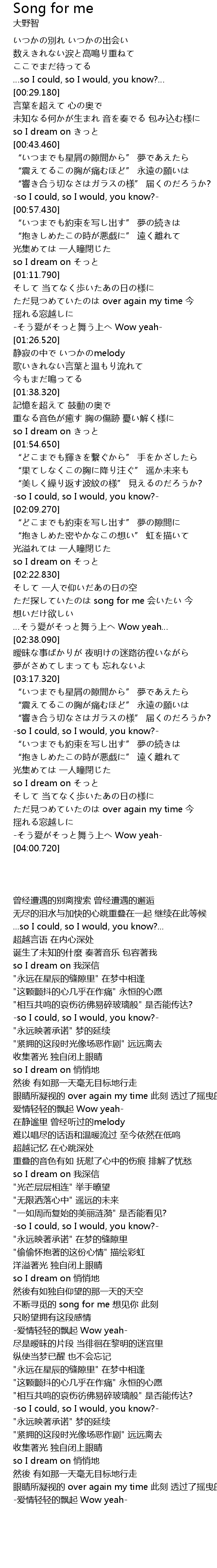 | [02:27.300] | 不断寻觅的 song for me 想见你 此刻 只盼望拥有这段感情 |