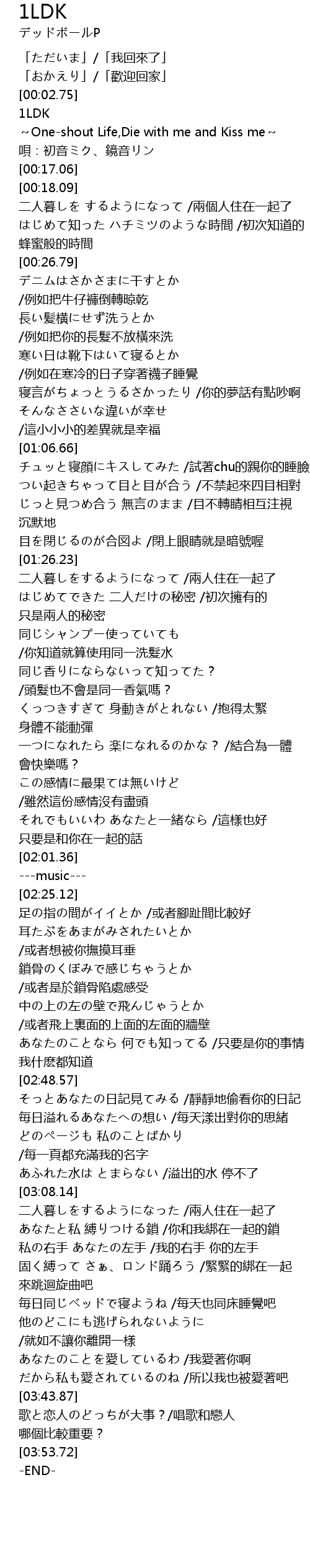 | [00:07.14] | ~One-shout Life,Die with me and Kiss me~ |