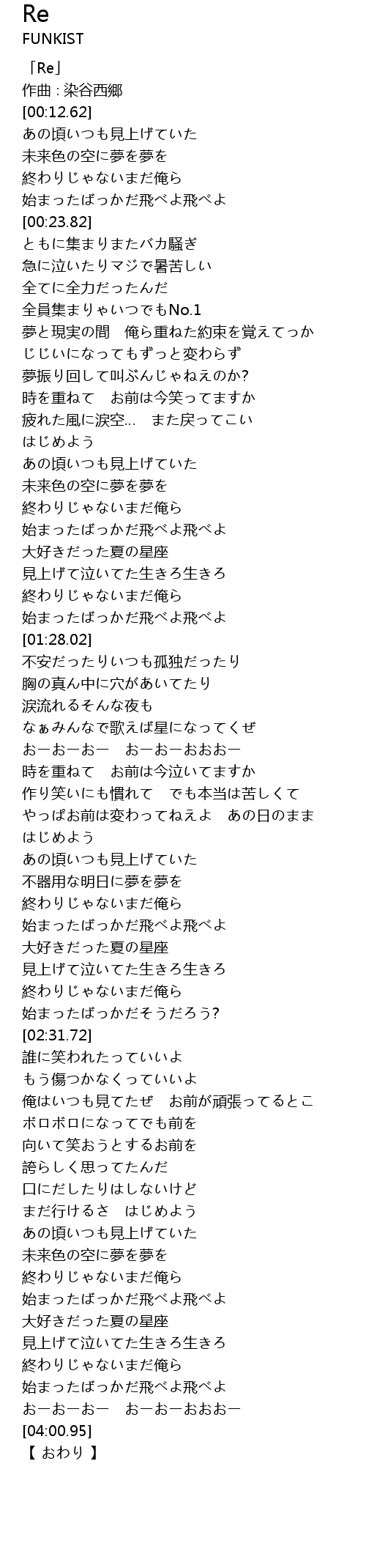| [01:13.73] | 終わりじゃないまだ俺ら |