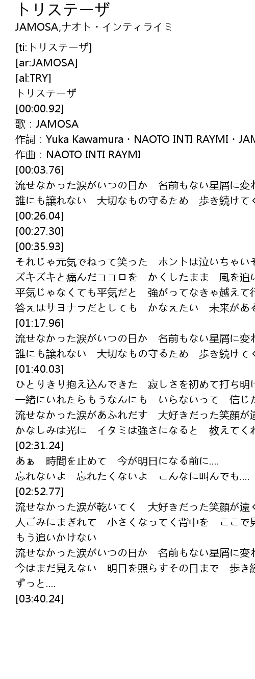 | [00:02.41] | zuo ci: Yuka Kawamura NAOTO INTI RAYMI JAMOSA LAN |