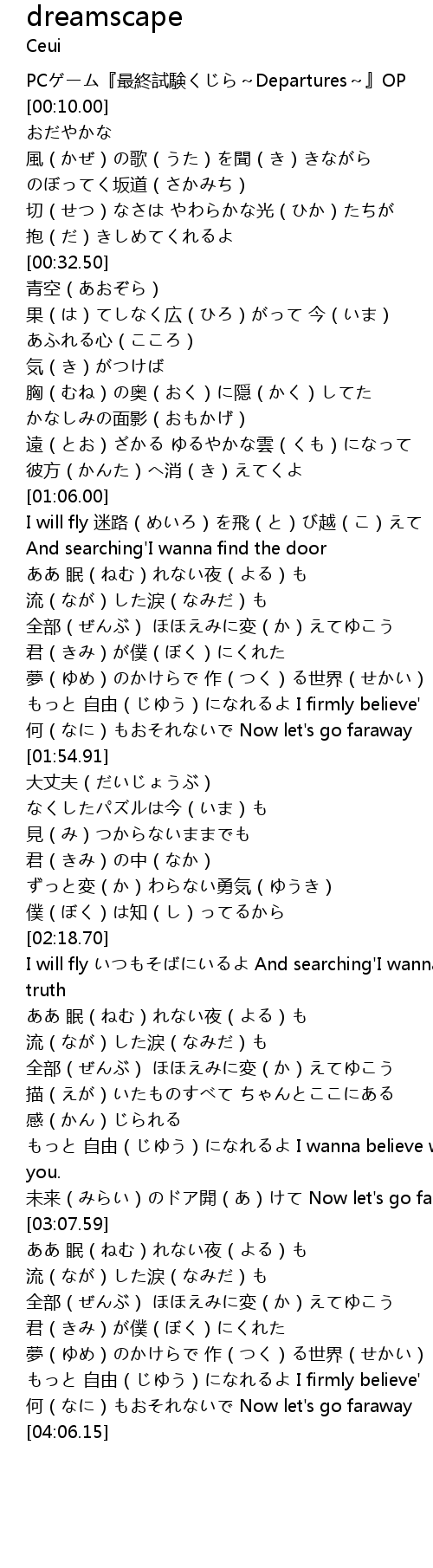 | [03:58.53] | 何(なに)もおそれないで Now let's go faraway |