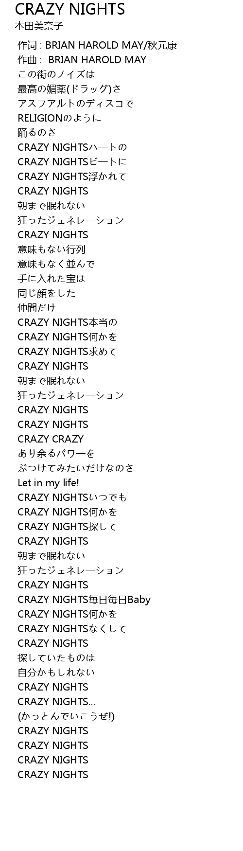 | [02:48.734] | CRAZY NIGHTS毎日毎日Baby |