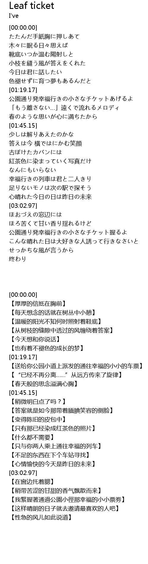 | [03:55.18] | 【我緊握著通過公園小徑那幸福的小小票劵】 |