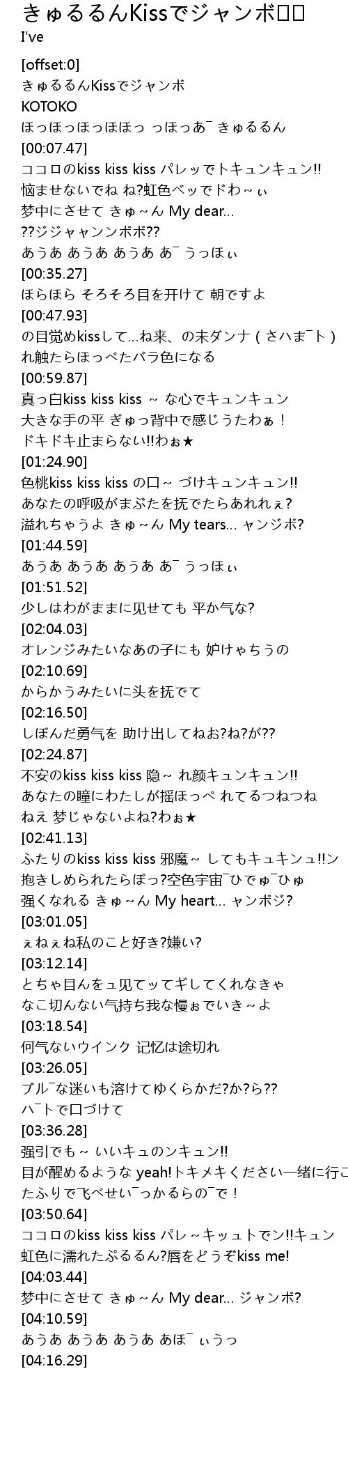 | [00:00.12] | きゅるるんKissでジャンボ |