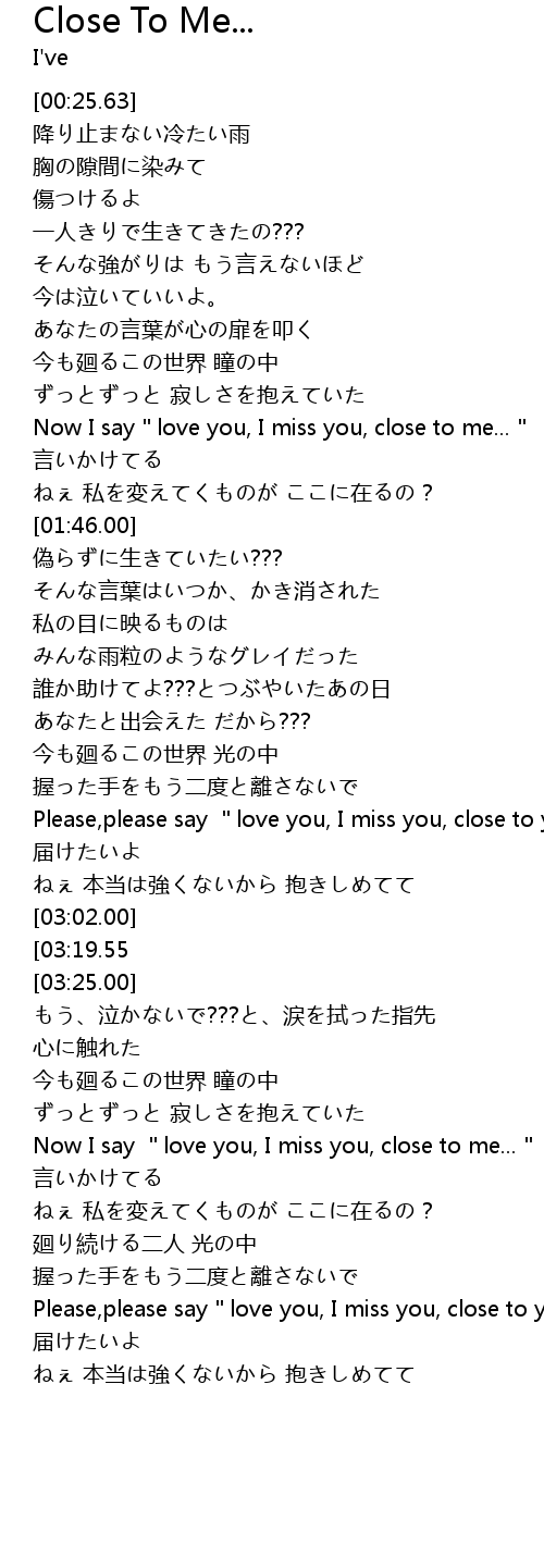 | [03:13.00][03:19.55] | Let me, I miss you, close to me... |