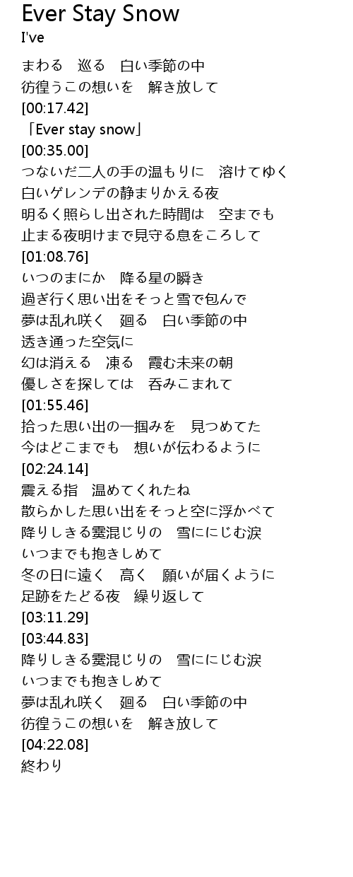 | [01:14.79] | 過ぎ行く思い出をそっと雪で包んで |