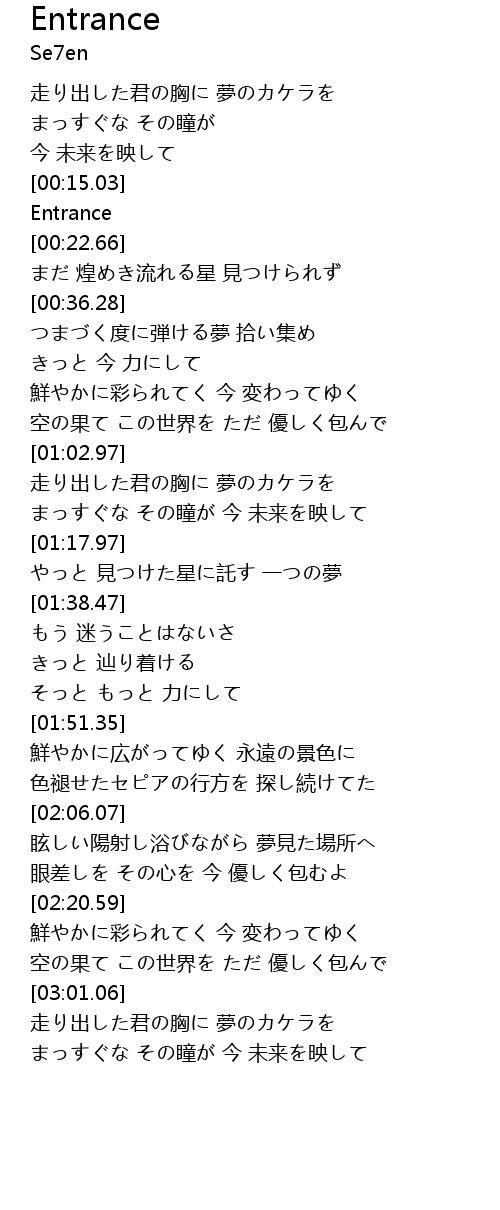 | [02:07.13] | 眩しい陽射し浴びながら 夢見た場所へ |