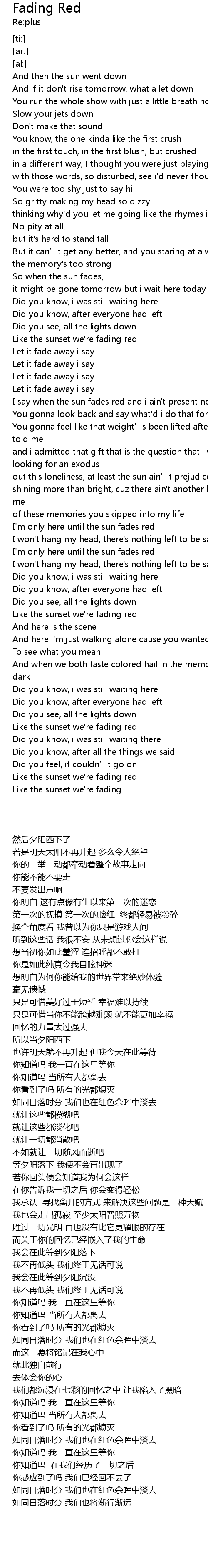 | [02:27.99] | 如同日落时分 我们也在红色余晖中淡去 |