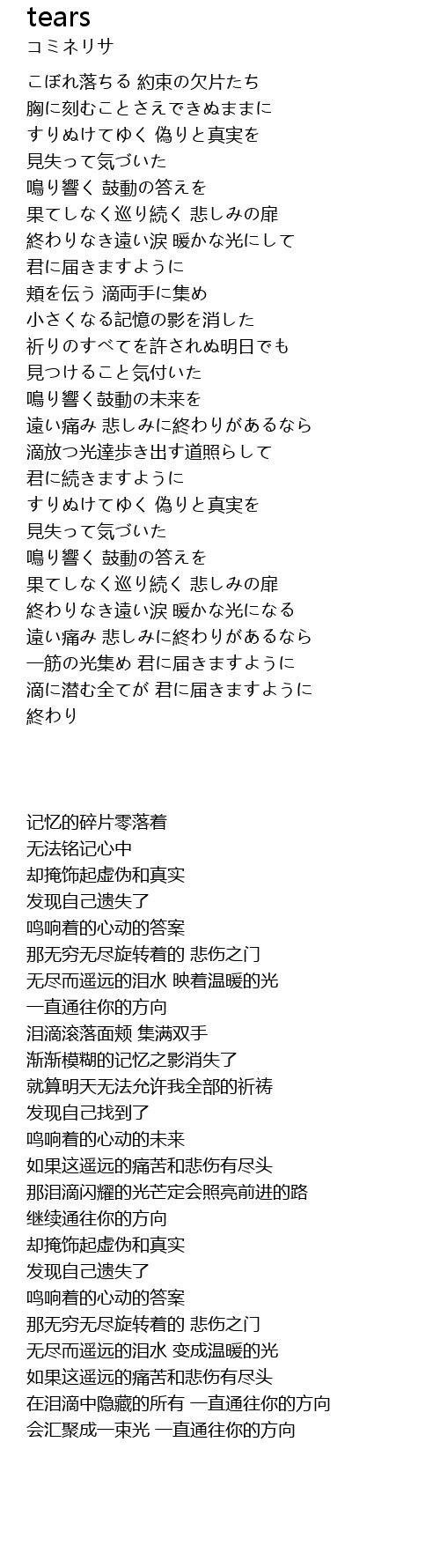 | [03:39.33] | 終わりなき遠い涙 暖かな光になる |