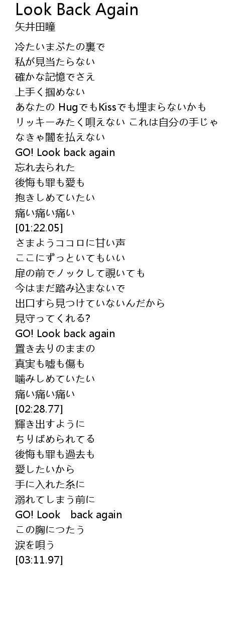 | [00:46.34] | あなたの HugでもKissでも埋まらないかも |