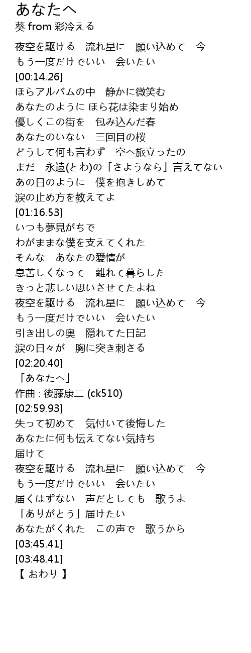 | [03:38.47] | あなたがくれた この声で 歌うから |
