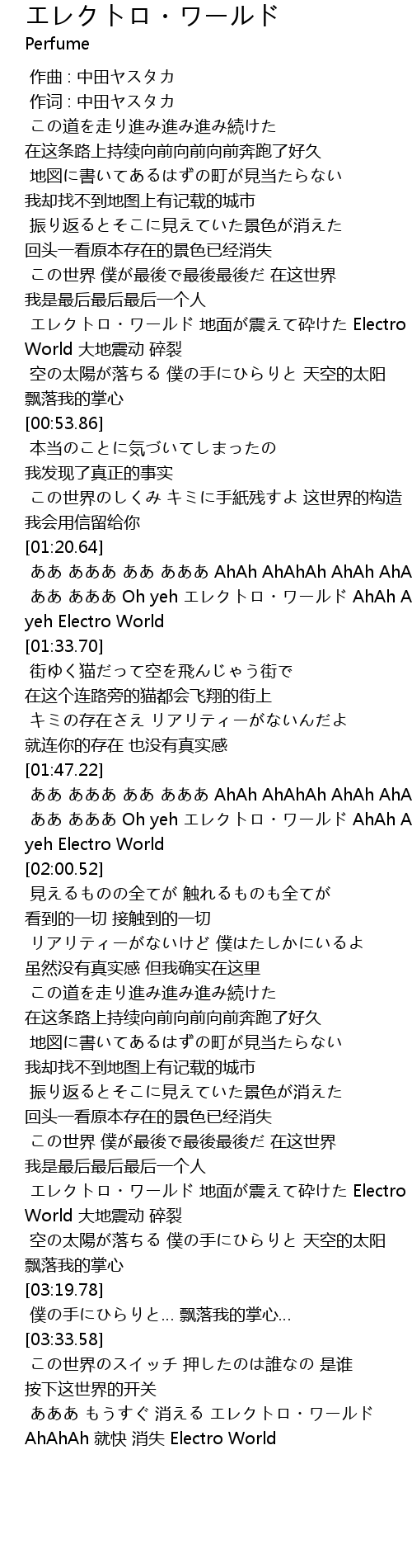 | [03:41.48] | あああ もうすぐ 消える エレクトロ・ワールド AhAhAh 就快 消失 Electro World |