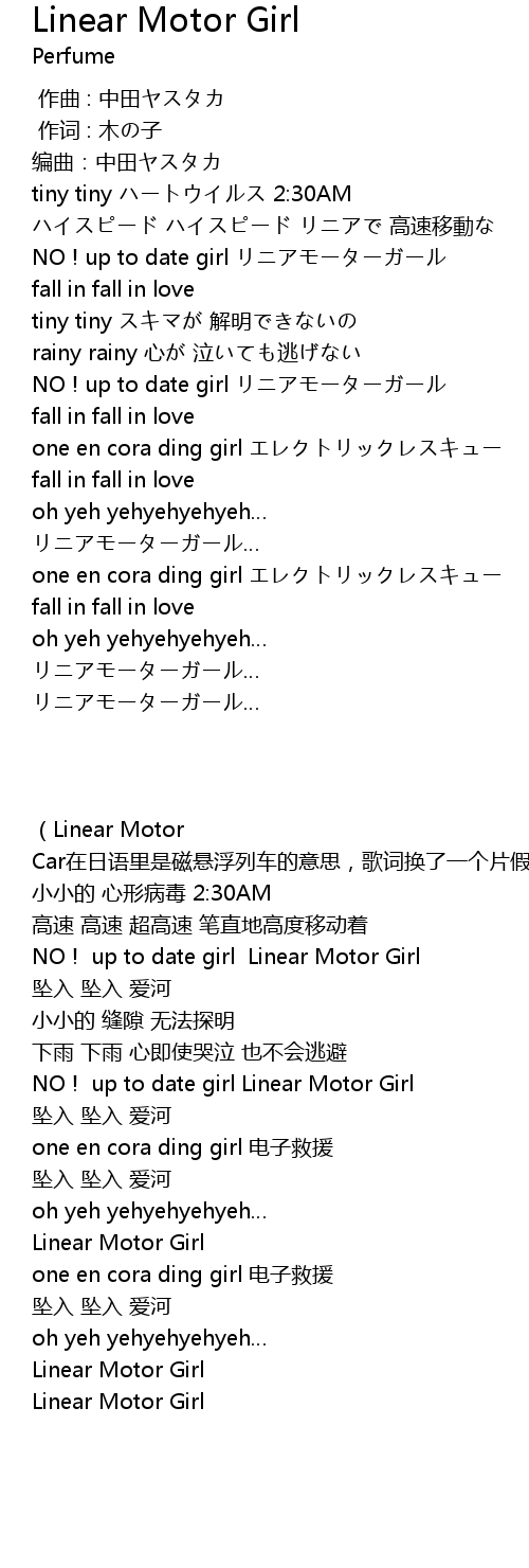 | [04:07.04] | (Linear Motor Car在日语里是磁悬浮列车的意思,歌词换了一个片假名把Car换成了Girl) |