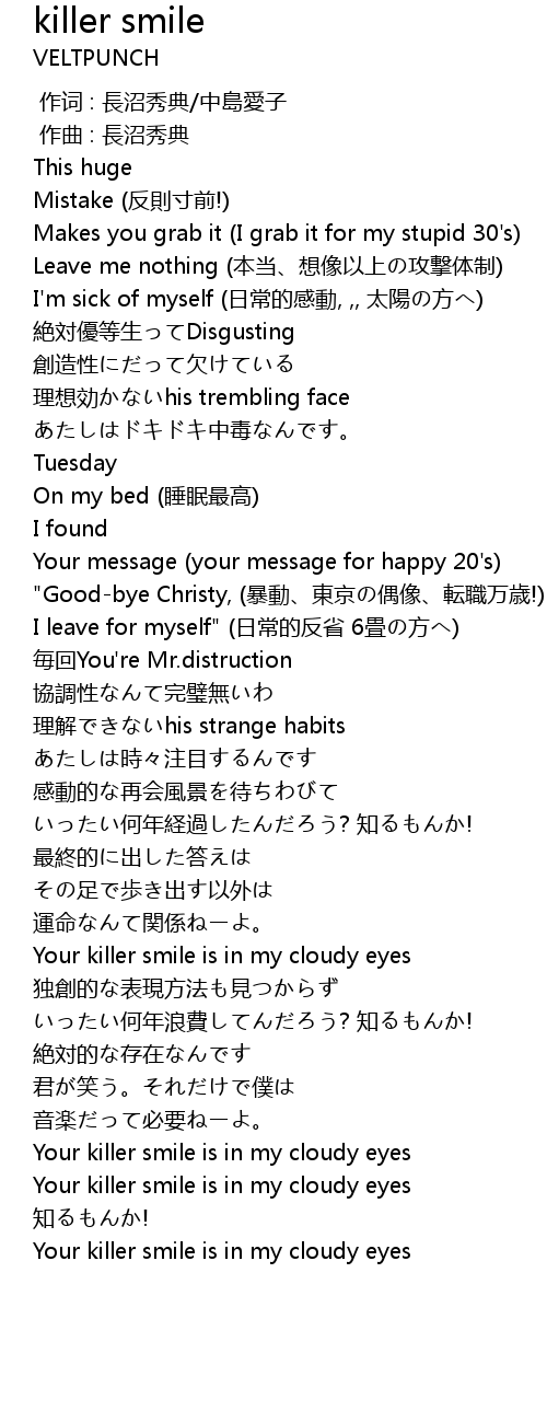 | [04:00.966] | Your killer smile is in my cloudy eyes |