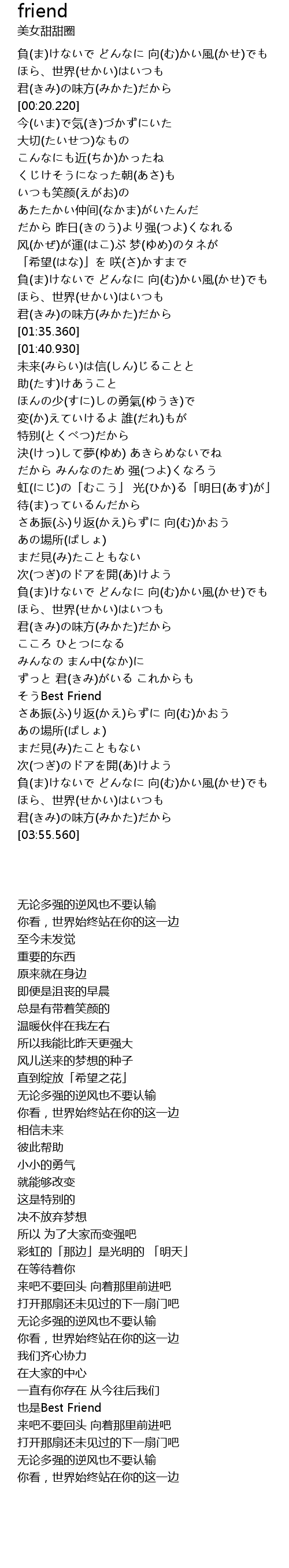 | [02:58.700] | ほら、世界(せかい)はいつも 君(きみ)の味方(みかた)だから |