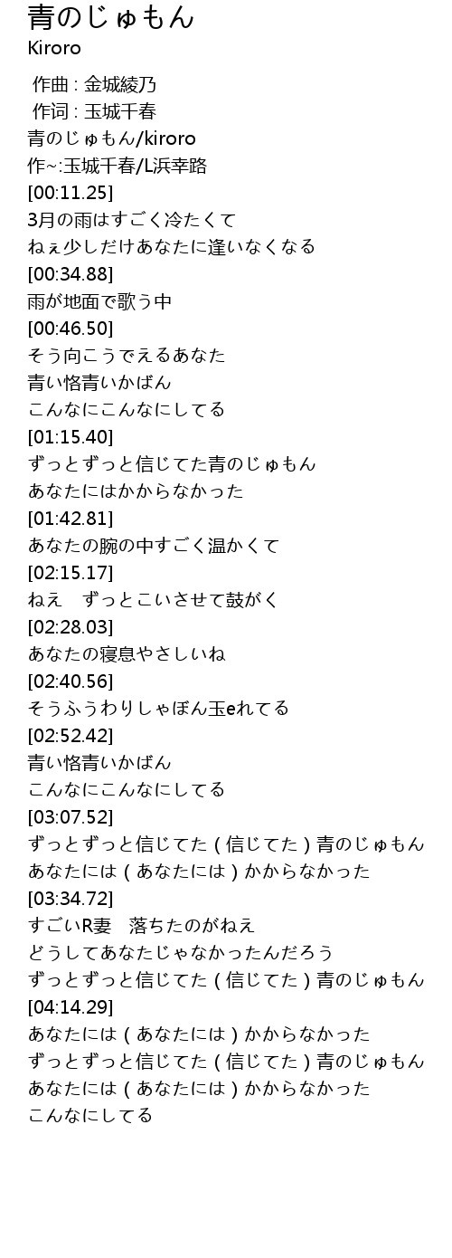 | [00:02.22] | 青のじゅもん/kiroro |