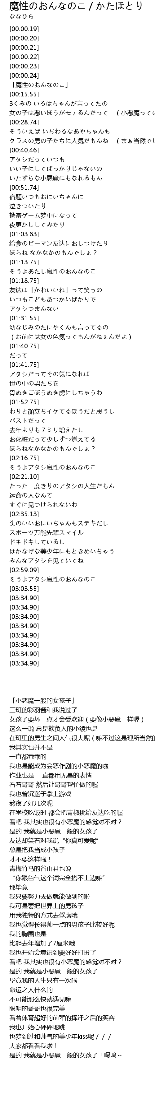 | [00:22.75] | 女の子は悪いほうがモテるんだって (小悪魔っていうんだって) |