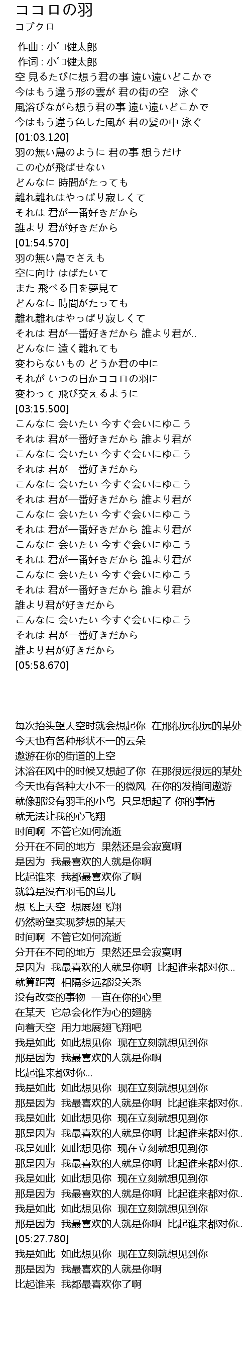 | [01:05.209] | 羽の無い鳥のように 君の事 想うだけ |