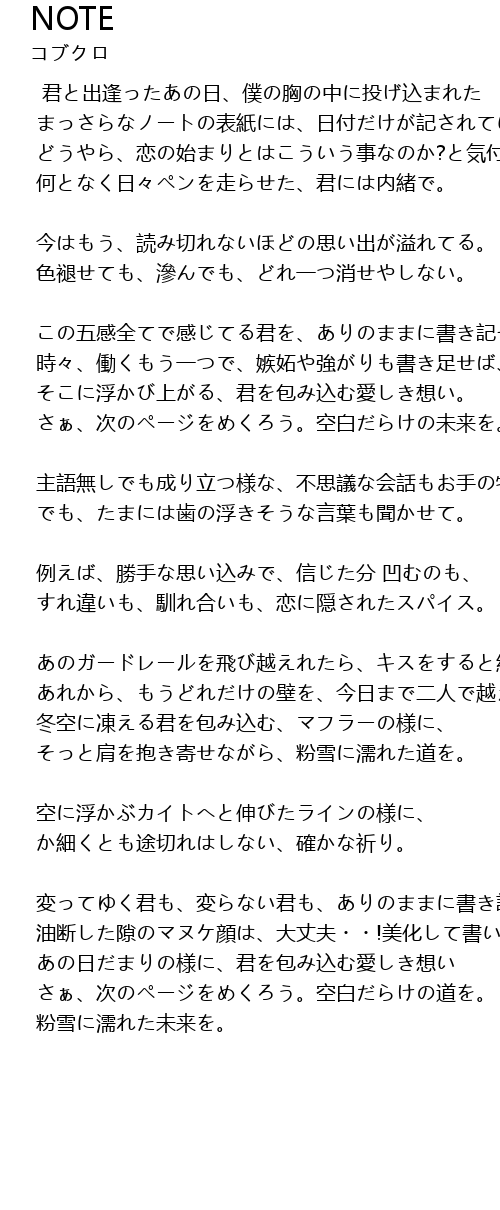 | この五感全てで感じてる君を、ありのままに書き記そう。 | |