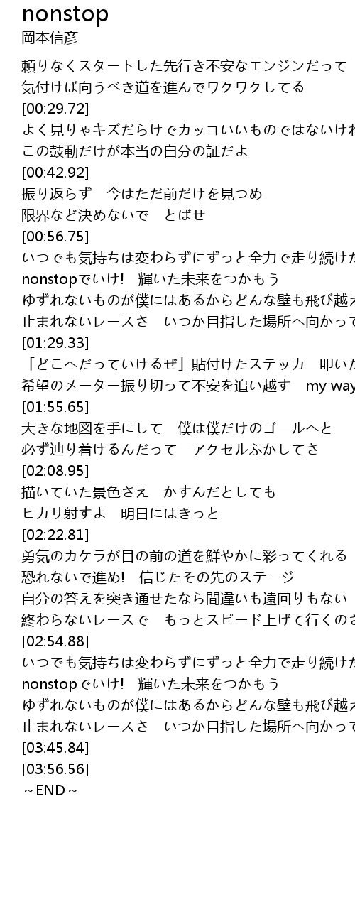 | [03:22.00] | nonstopでいけ! 輝いた未来をつかもう |