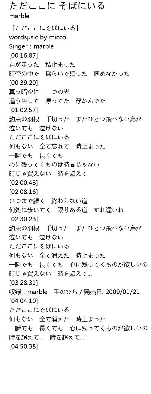 | [03:30.31] | 収録:marble - 手のひら/発売日: 2009/01/21 |