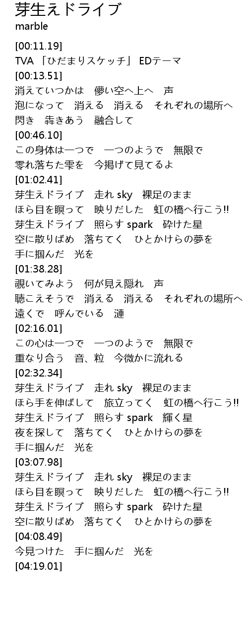 | [03:40.88] | 芽生えドライブ 走れ sky 裸足のまま |