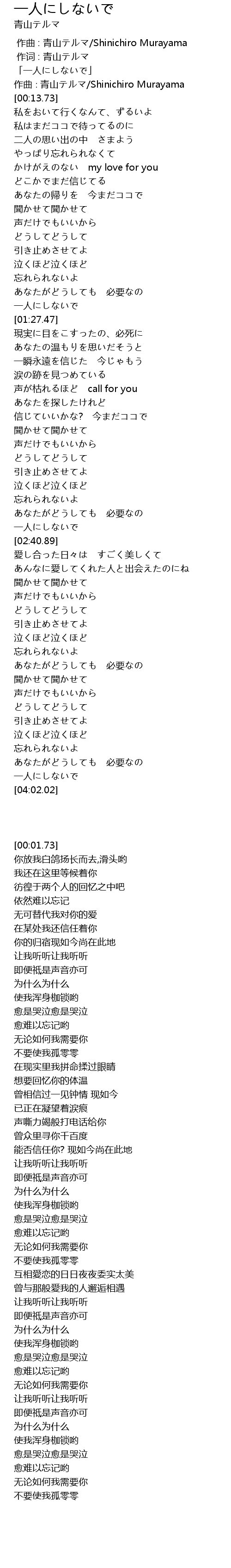 | [00:01.73] | 「一人にしないで」 |