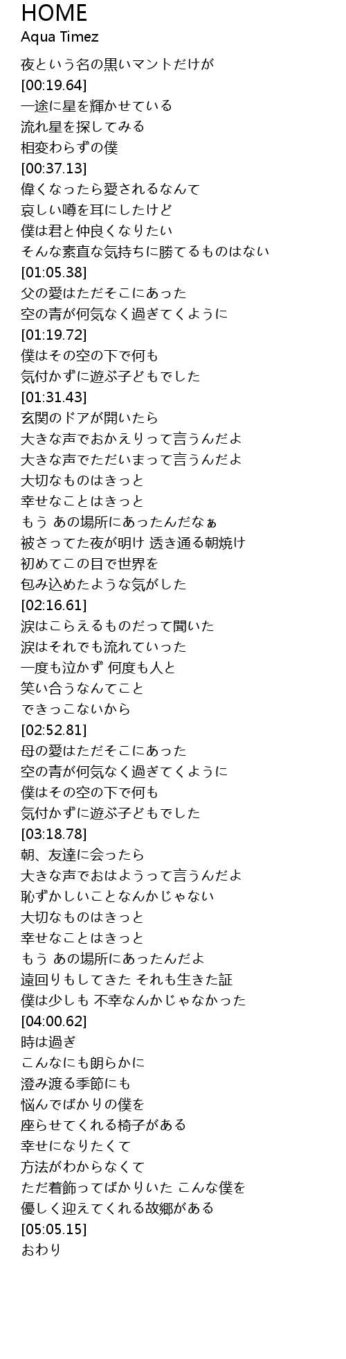 | [01:38.61] | 大きな声でおかえりって言うんだよ |
