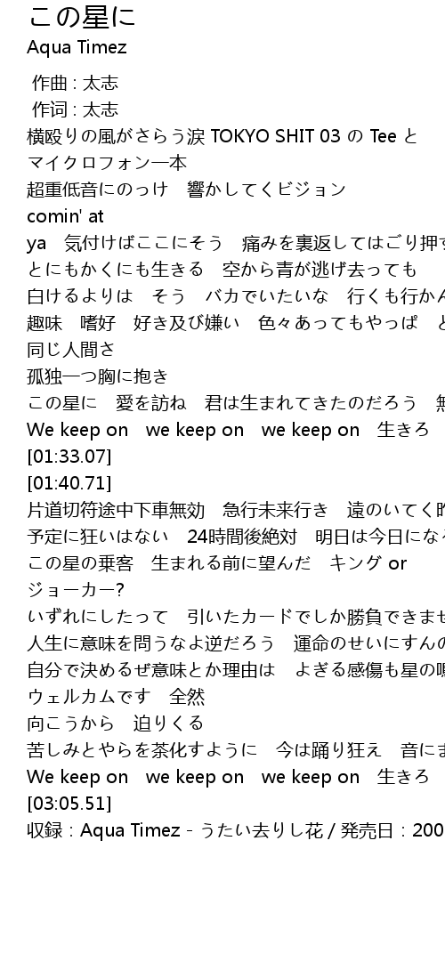| [03:07.51] | shōu lù: Aqua Timez qù huā fā mài rì: 2009 03 11 |
