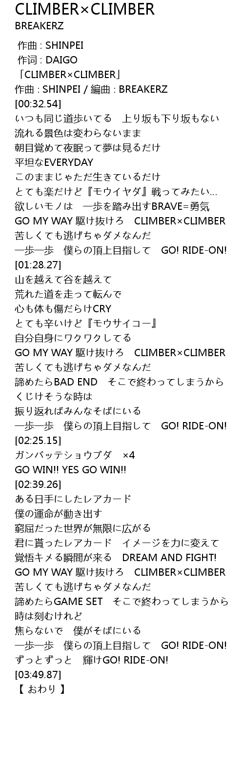 | [01:52.59] | GO MY WAY 駆け抜けろ CLIMBER×CLIMBER |