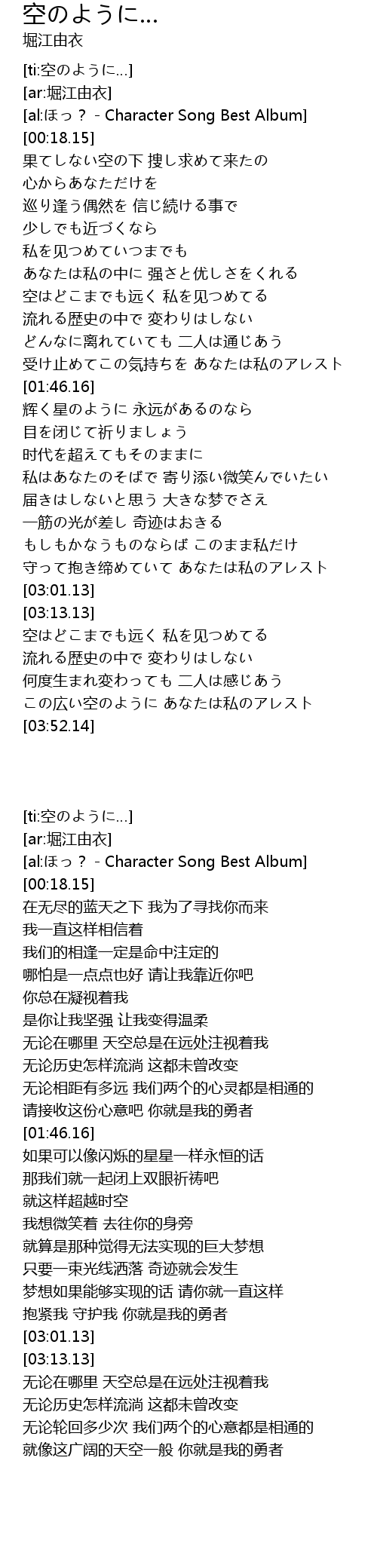 | [03:40.50] | この広い空のように あなたは私のアレスト |