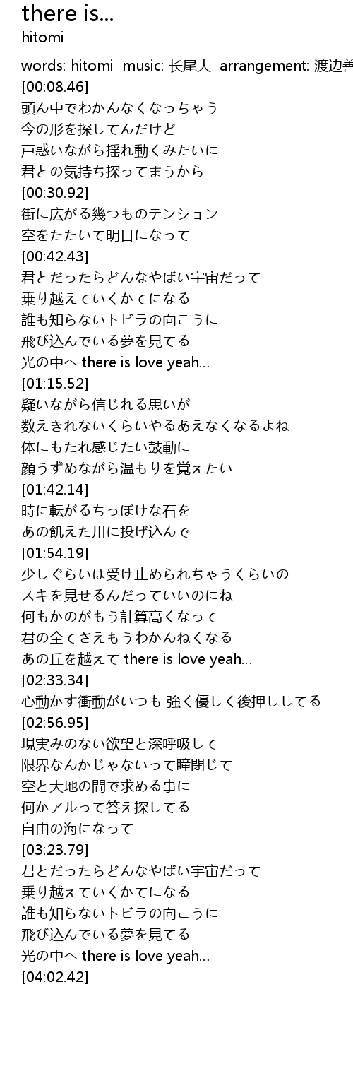 | [00:04.14] | words: hitomi music: 长尾大 arrangement: 渡边善太郎 |